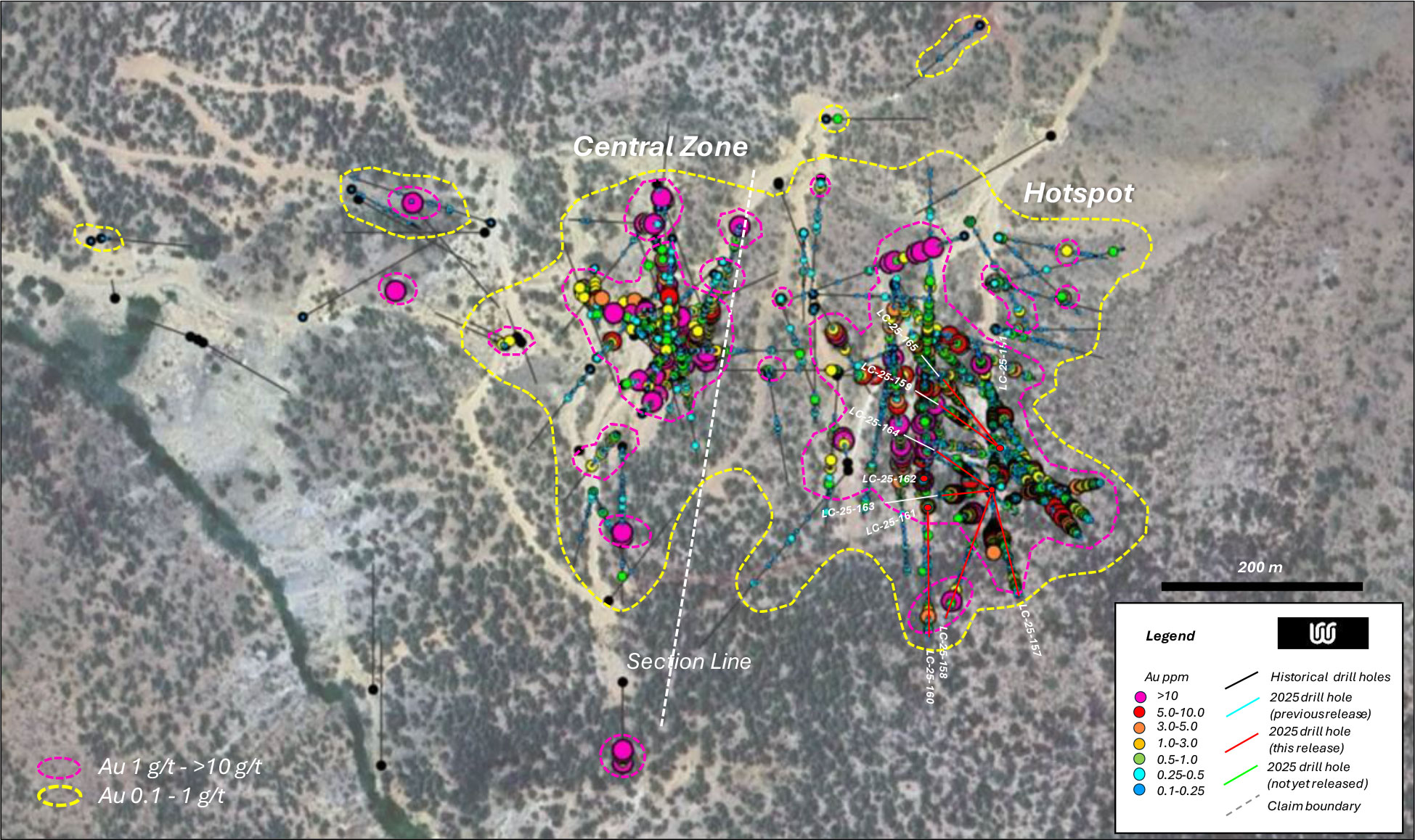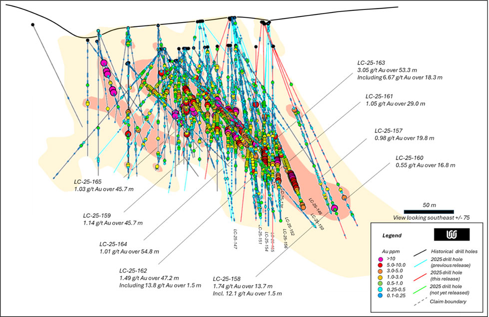 - 1.49 g/t Au over 47.2 m starting at 86.9 m, including 13.8 g/t Au over 1.5 m in hole LC-25-162