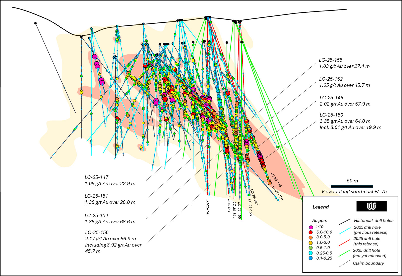 - Drill hole LC-25-154 returned 1.38 g/t Au over 68.6 meters starting at 97.5 meters, including 2.29 g/t Au over 15.2 meters.